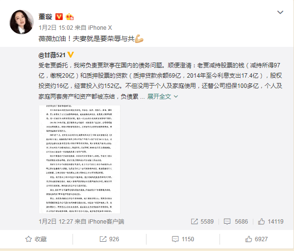 如今,贾跃亭赴美造车1年,归期未知。甘薇也在今年4月紧随丈夫的步伐因未履行一桩涉及14亿元的经济案件而被纳入失信名单,成了“老赖”。甘薇曾在微博上专门发文澄清丈夫贾跃亭的债务问题,一众好姐妹好闺蜜纷纷转发鼓励支持甘薇,其中就有董璇。那时她说:“夫妻就是要荣辱与共。”
