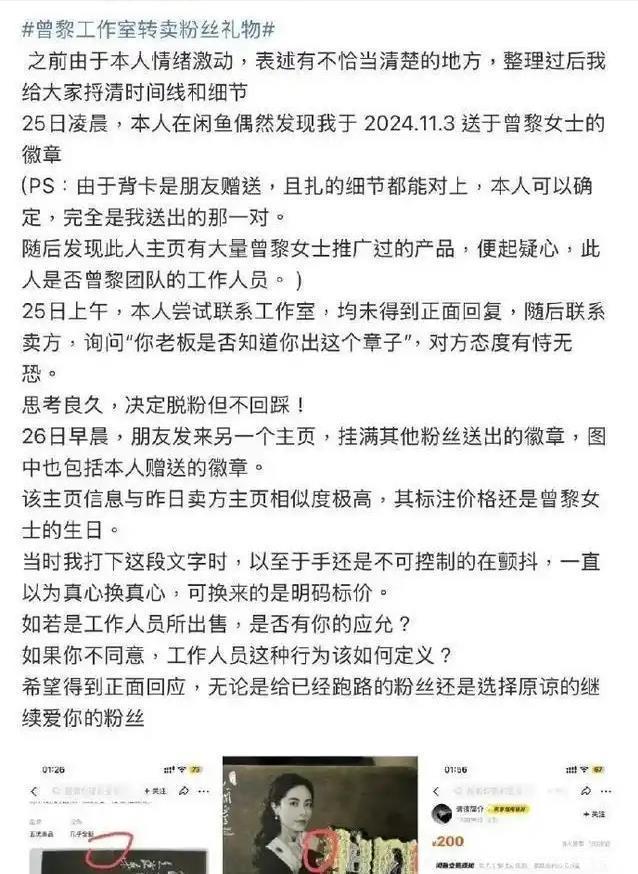 这个小可怜粉丝“十三州府”,从2024年11月开始,自掏腰包耗时数月,为亲爱的曾黎设计了“917”生日定制徽章,亲手交到偶像手中,万万没想到啊,2025年3月,这枚徽章竟出现在闲鱼平台,88块钱就给打包卖了。
