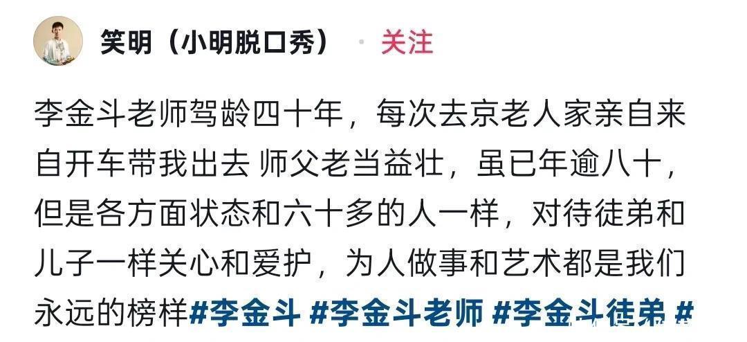 前些日子,李金斗的徒弟笑明发了一条动态,里面有他和师父一起开车送他回家的照片和文字。