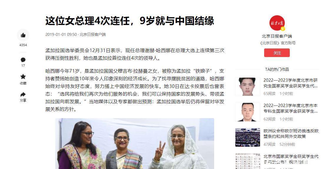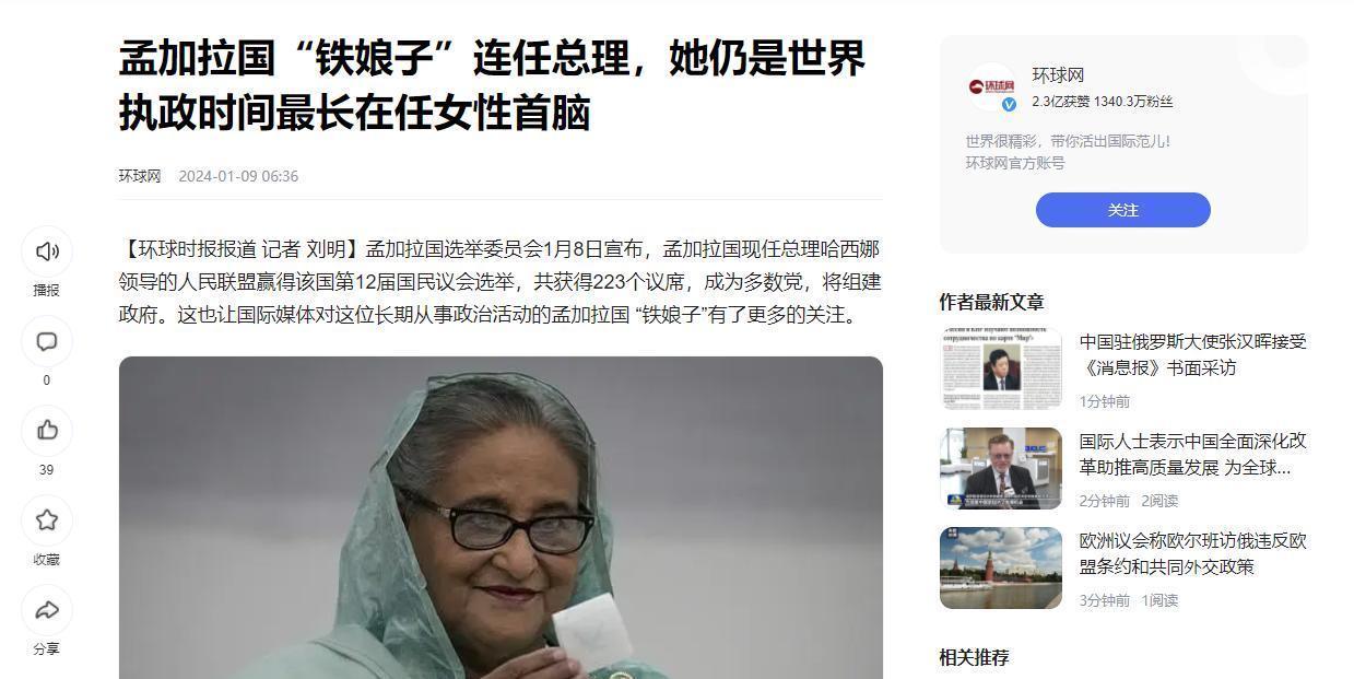 2、孟加拉国“铁娘子”连任总理,她仍是世界执政时间最长在任女性首脑《环球网》2024-01-09