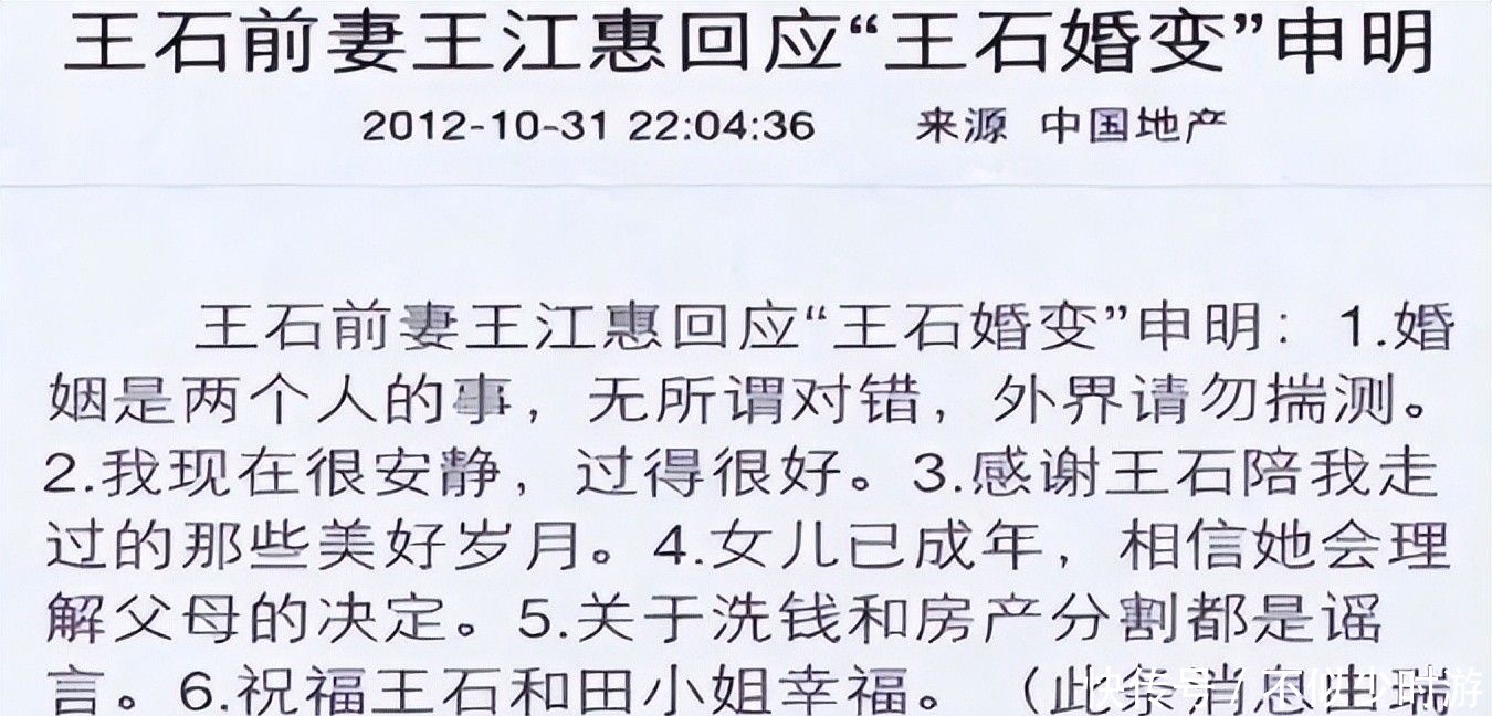 2012年,离婚消息被证实。王江穗发表声明,堪称“前妻典范”——她没有指责,没有抱怨,仅表示“婚姻是两个人的事,无关对错”,并大方祝福王石与田小姐。