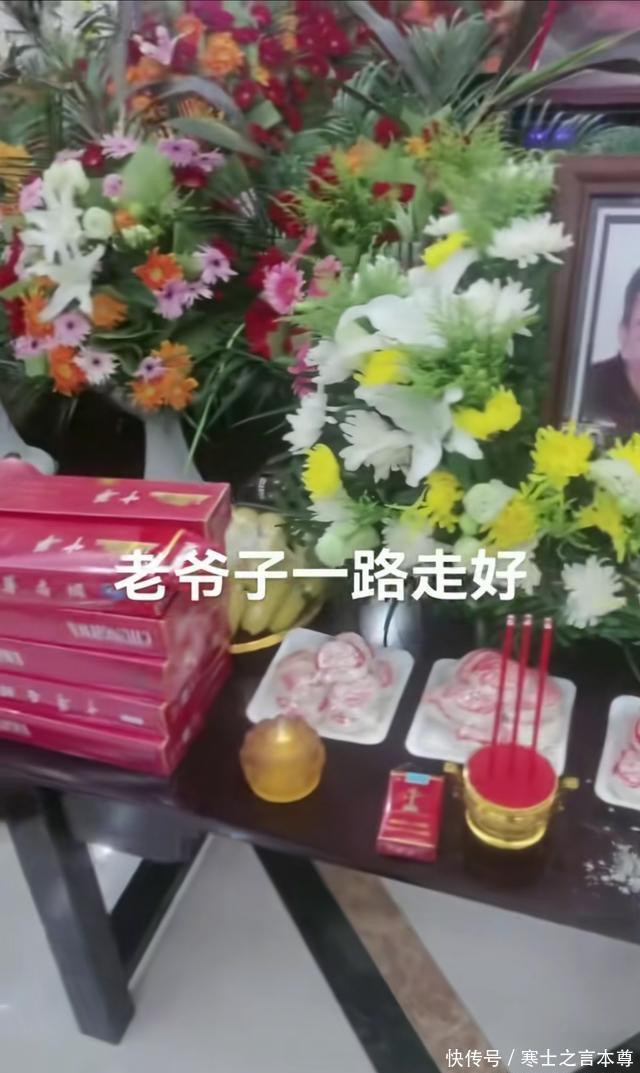 灵堂前摆满了中华烟和各种美食,花圈摆满全场,给足了老爷子面子。