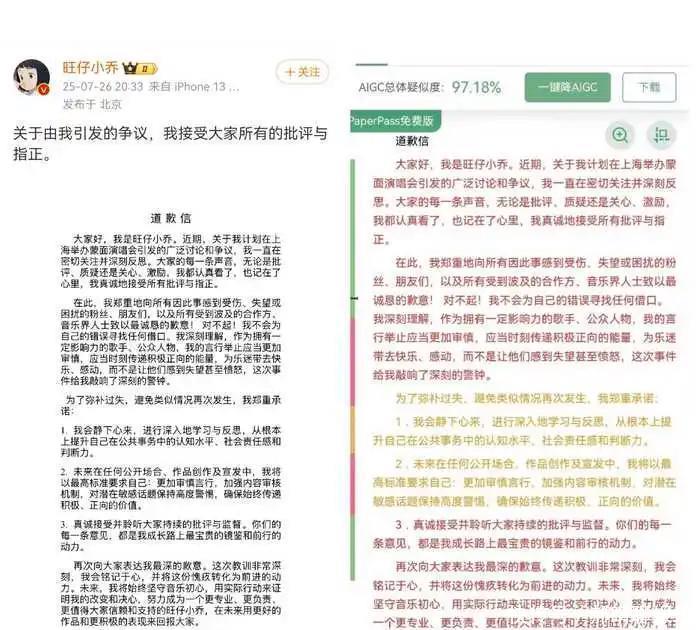 “旺仔小乔”7月26日发布道歉信称,关于计划举办蒙面演唱会引发的广泛讨论和争议,自己一直在密切关注并深刻反思。