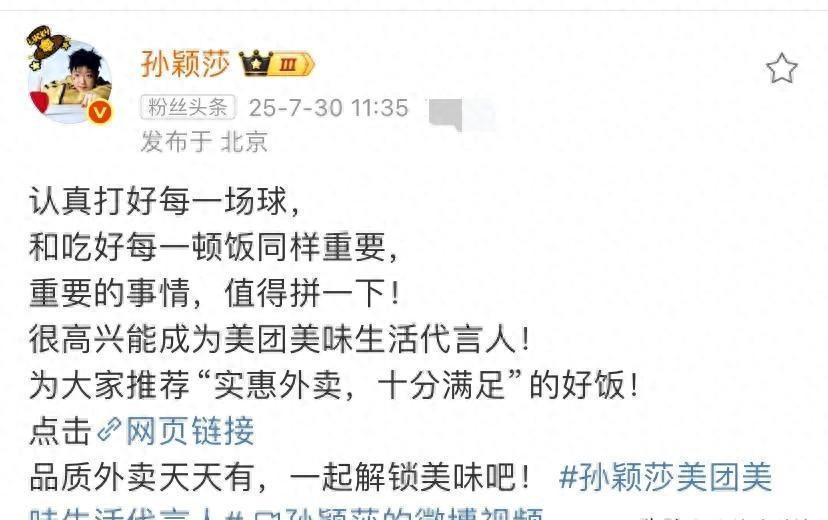 7 月 30 日,孙颖莎带来了一个好消息 —— 她成为了美团美味生活的代言人。视频里的她一句 “好好吃饭”,透着满满的接地气,可爱模样让人忍不住喜欢。