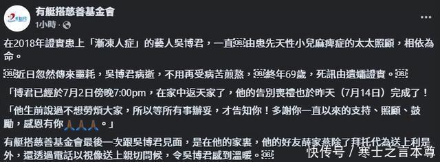 TVB资深绿叶演员吴博君,因为渐冻症在7月2日去世,终年69岁。
