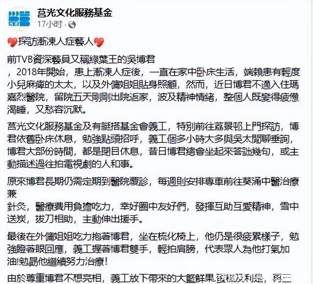 吴博君上一次被关注,还是去年4月,当时他病情加重,香港某义工团体到吴博君家中探望,指吴博君整日愁眉苦脸,模样很疲惫,只能用睁眼回应,只有提到演艺圈的人和事,他才会稍显精神,回答几句。