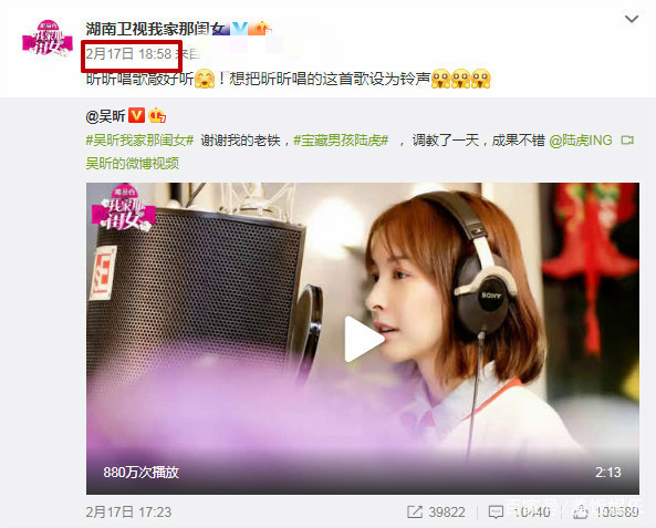 (2月17日 湖南台综艺宣传了吴昕的微博)