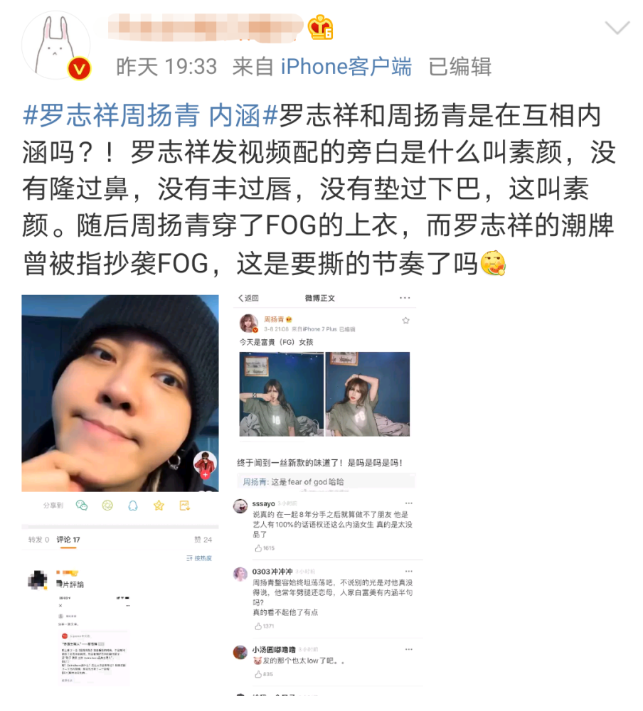 有网友发现,罗志祥在某短视频平台上传一则视频,旁白里有几句“什么叫素颜?没有贴过假睫毛、没有隆过鼻、没有丰过唇、没有垫过下巴,这叫素颜”,被认为是在暗讽周扬青曾整过容。
