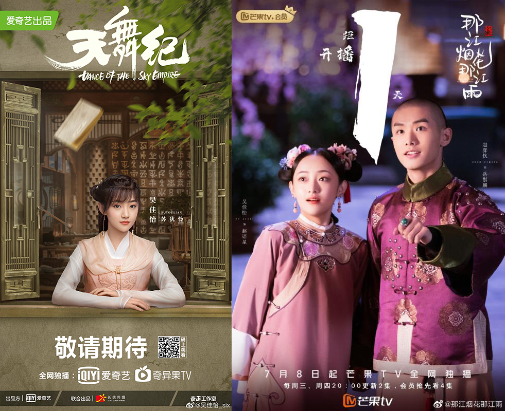 一部是爱奇艺重磅的《天舞纪》搭档许凯,一部是芒果TV的《那江烟花那江雨》搭档赵弈钦,于妈的小作文里也提到,虽然搭的都是欢娱的艺人,但却是平台方钦点吴佳怡做的女主,在寒冬时能拿下两个戏女主,应该挺有本事的。