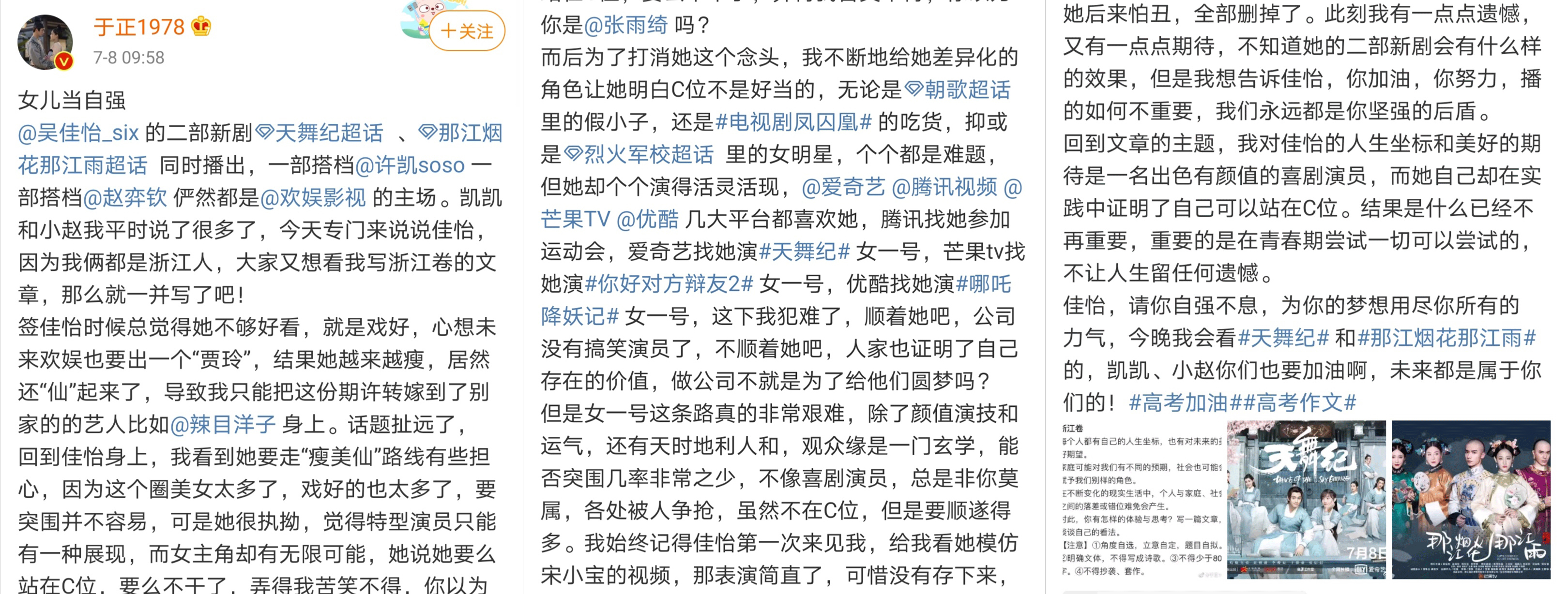 说起于正的小作文,那绝对算得上是娱乐圈不定期更新的“保留节目”了!昨天于正再发长文,洋洋洒洒几百字为旗下新晋95后小花吴佳怡造势。