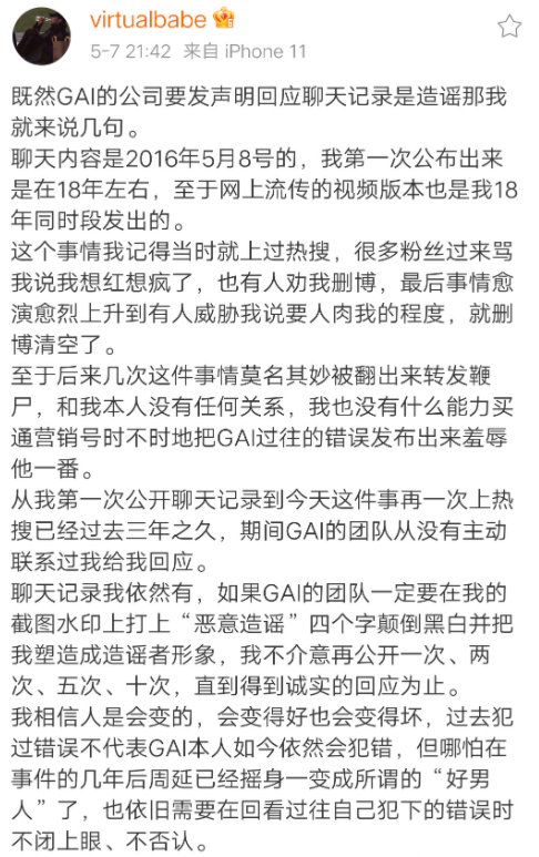 次日,该事件当事人女粉丝发长文对此事做出回应,她表示聊天内容是2016年5月8号的,第一次公布出来是在18年左右,网上流传的视频版本也是18年同时段发出的,因受到威胁便删博清空。同时她否认了“恶意造谣”的指控,“公开聊天记录到今天这件事再一次上热搜已经过去三年之久,期间GAI的团队从没有主动联系过我给我回应。”