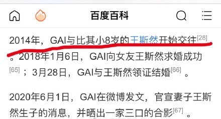 但有网友发现,GAI以前打造“专情”“长情”人设的时候,特意强调和王斯然恋爱多年,早在2014年就开始交往了。如今,为了力保“爱妻”人设不崩塌,又强调和王斯然是2016年开始交往的,并修改了百科。