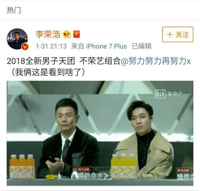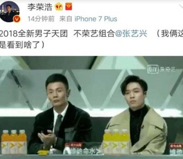 1月31日晚九点,李荣浩发博喊话张艺兴组建2018全新男子天团“不荣艺”,还玩心大起的配了一张自己和张艺兴神同步冷脸鼓掌的动图。