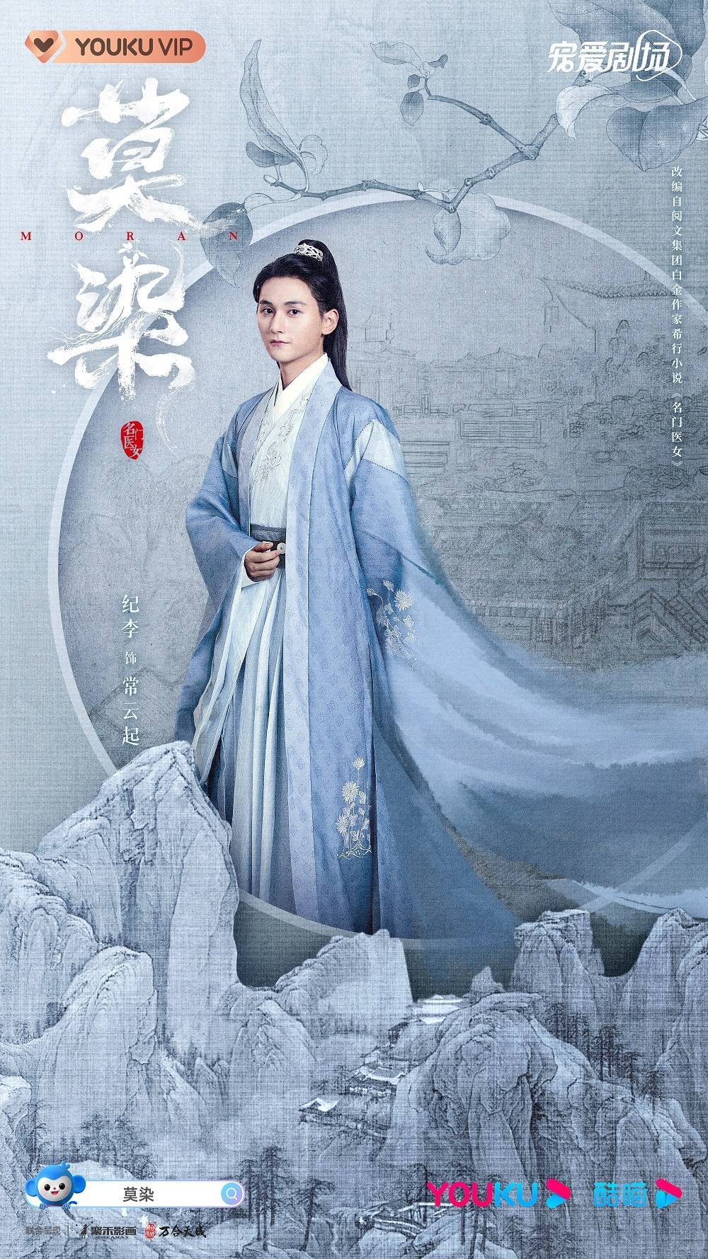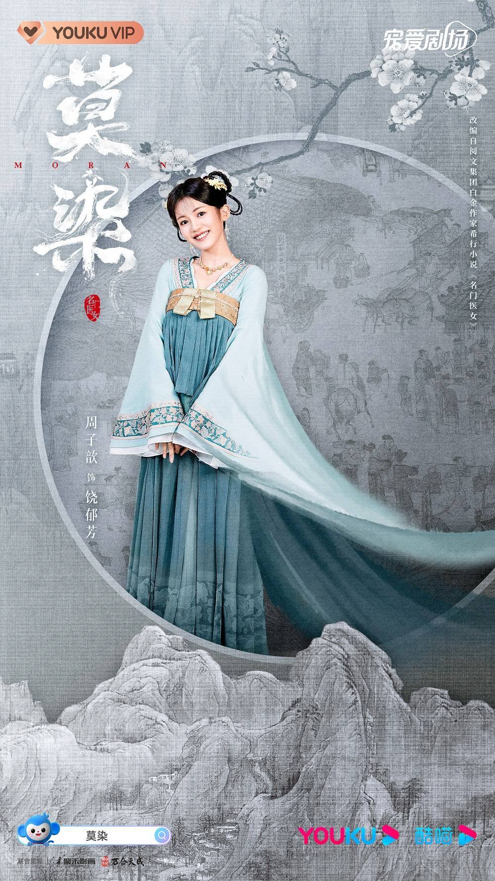 本次海报背景取材自苏州园林的月洞门,演员们站在以中国古代工笔画绘制而成的亭台楼阁和嶙峋怪石之间,人画两相映,现实与虚幻交融。绵延起伏的山水暗示着《莫染》的故事并非拘囿于家宅庭院之间,而是放眼于家国山河之上,有儿女私情更有人间大爱。每一幅海报单独观看时能看到符合角色身份的生活环境,拼在一起又构成了一幅完整的古典画卷。整体设计充满巧思和韵致,审美高级,别具一格。