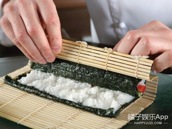 首先在温热的米饭里拌上寿司醋,随后在竹帘上铺一张紫菜,加上寿司饭,卷米饭的同时加上萝卜条,黄瓜之类配菜,卷起竹帘,压紧,切段,挤上沙拉酱,一份家常版招牌寿司就完成了。