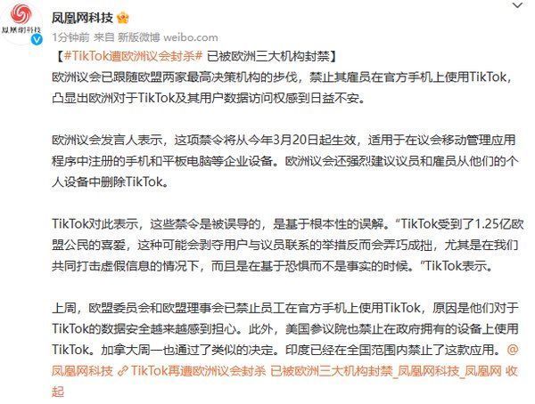 紧随其后的是欧洲,继美国和加拿大之后,欧洲议会也表示将禁止其员工在手机上下载抖音国际版TikTok。TikTok官方已经对欧洲议会的封禁作出了回应,他们表示:这些禁令是被误导的,是基于根本性的误解。TikTok受到了1.25亿欧盟公民的喜爱,这种可能会剥夺用户与议员联系的举措反而会弄巧成拙,尤其是在我们共同打击虚假信息的情况下,而且是在基于恐惧而不是事实的时候。