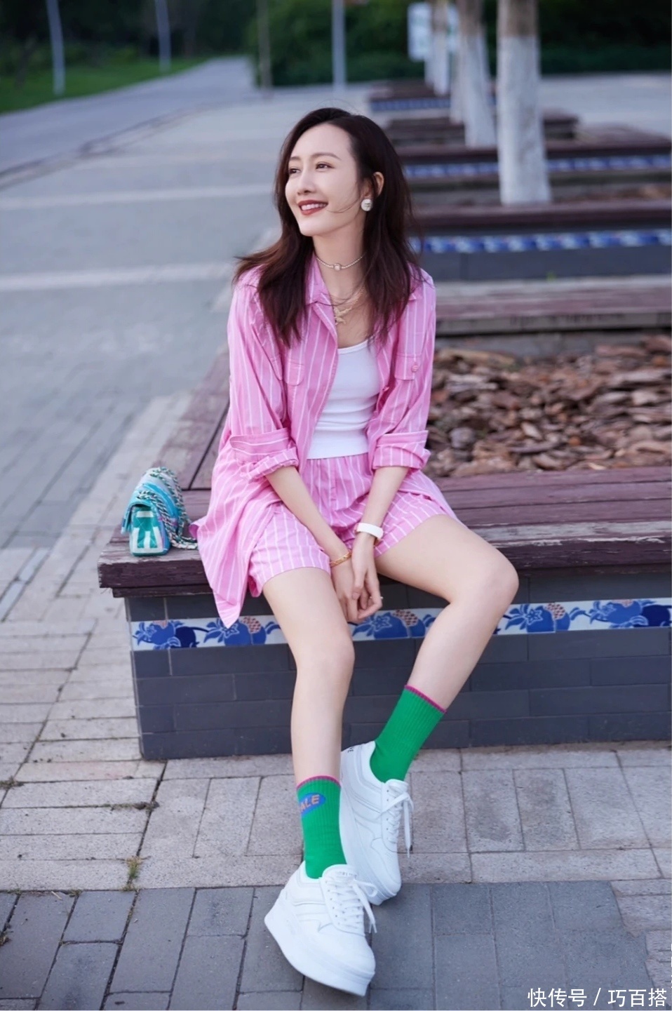 荷花粉衬衫套装,清新减龄又有少女感,单品上身活力满满,宽松肥大的条纹衬衫宽松,遮肉显瘦又很高级,对于王鸥这种骨感型身材来说,驾驭起来一点难度都没有。