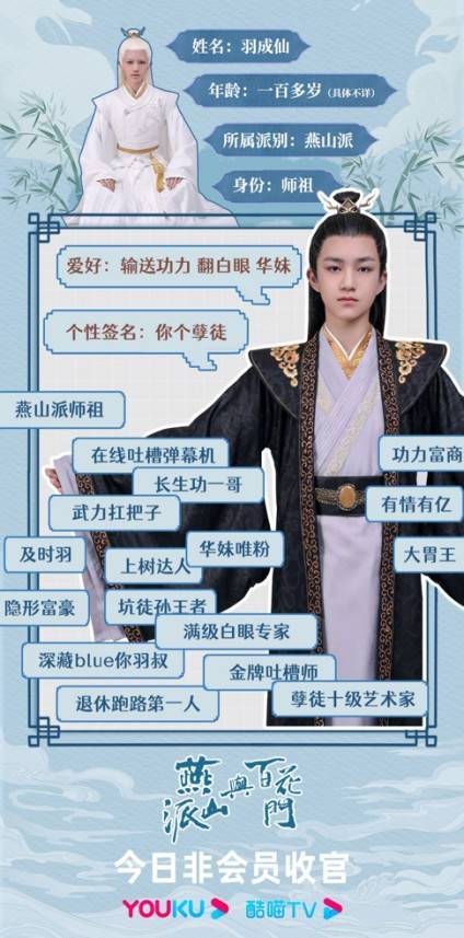 由优酷、新圣堂影业、华谊兄弟出品,李小江、夏雨执导,改编自同名漫画的轻喜剧《燕山派与百花门》目前非会员也已迎来收官,据悉,这部剧在云南实地取景拍摄,除了带给我们美景享受和太多的欢笑和乐趣以外,还给我们塑造了不少让人念念不忘的人物形象,比如师祖羽成仙、小师弟君未期、小师妹离一心等等。