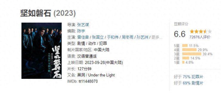 国庆档多部新片豆瓣已经开分,其中,由张艺谋执导的犯罪电影《坚如磐石》开分6.7分。