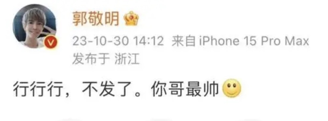从侯明昊的回应来看,他还是挺给郭敬明面子的。不过这也正常,毕竟他现在还在郭敬明的剧组当中。如果闹翻了,还真的对他一点好处都没有。因此,他发文维稳粉丝的情绪,其实也很正常。
