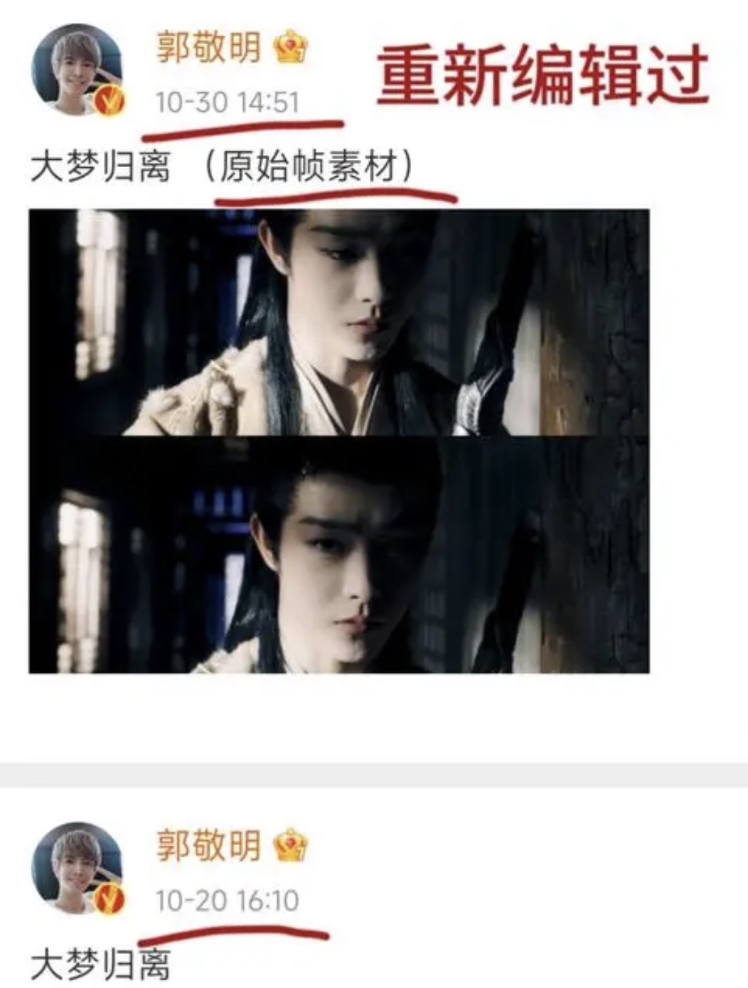 不过更有意思的是,郭敬明删了侯明昊这条微博之后,他居然又去编辑了之前发的男二田嘉瑞的动态。而最近网传田嘉瑞是郭敬明新捧的人。因此,网友们质疑郭敬明这番举动,是在内涵男主侯明昊。