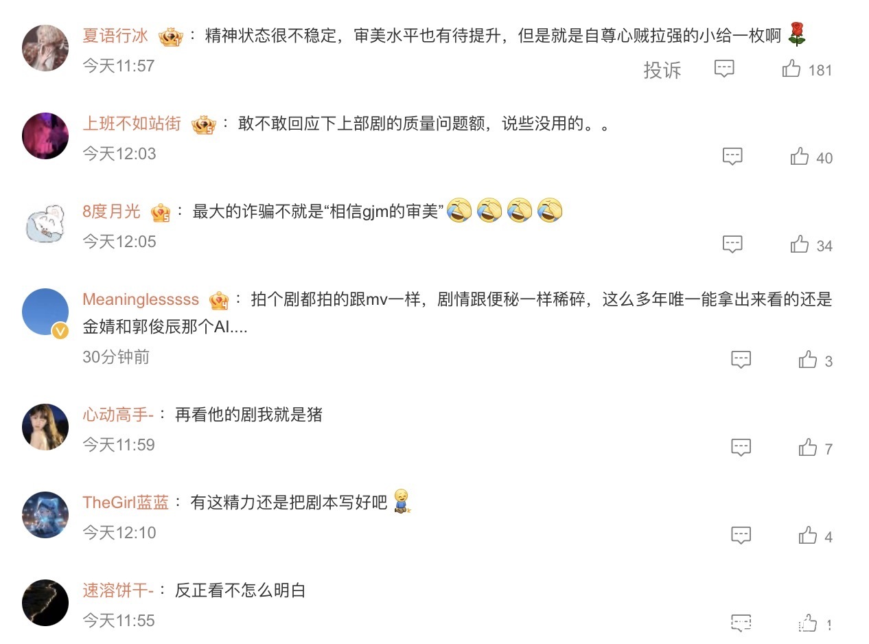 不过,虽然郭敬明列出了10点,但是依旧没有平息风波。并吐槽郭敬明想一出是一出,精神状态不稳定,审美也有待提高,搞得拍个剧搞得像MV一样,每部剧的质量都让人失望。更嘲讽有这个精力,不如好好将剧本写好。
