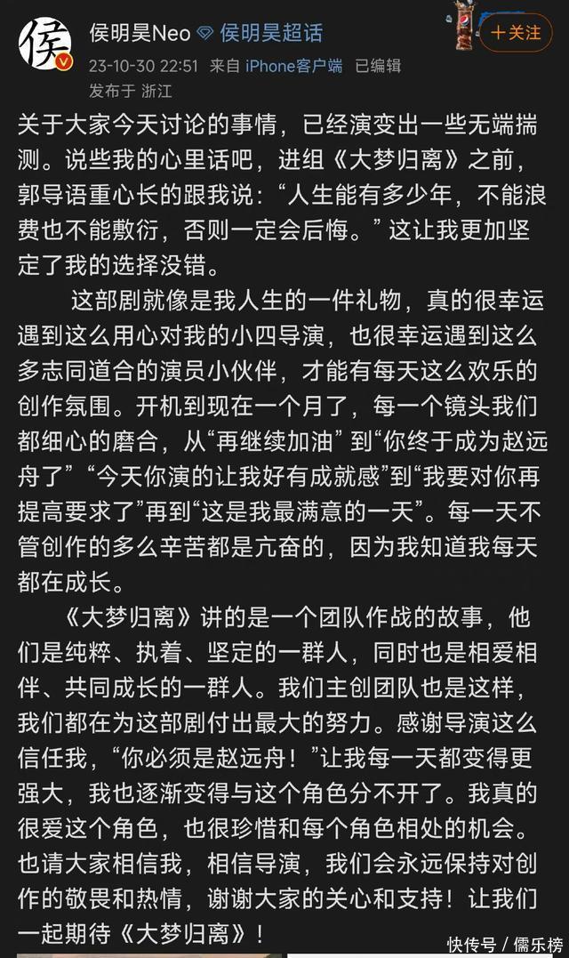 而在舆论发酵后,侯明昊第一时间站出来发声回应力挺郭敬明,侯明昊在文中分享了与郭敬明的相处往事,称与郭敬明合作的这部剧就像是人生的一件礼物,“真的很幸运遇到这么用心对我的小四导演,也很幸运遇到这么多志同道合的演员小伙伴,才能有每天这么欢乐的创作氛围。”侯明昊还晒出了剧组的大合照,力辟剧组不合的谣言。