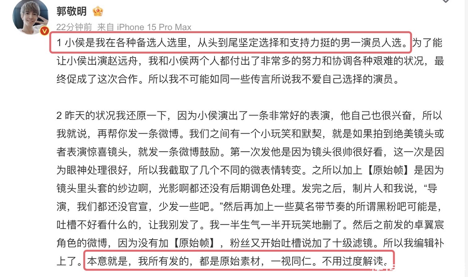 或许见到舆论持续发酵,可能会影响到剧的正常拍摄与播出,郭敬明发长文回应了删文争议。他在长文中否认区别对待侯明昊,称小侯是他从头到尾坚定的男一人选,并列出了10点来还原了前一日删剧照事件的始末。