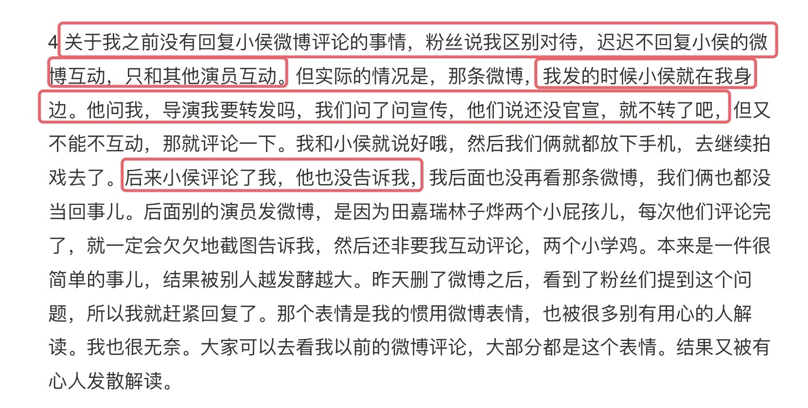 并回应了没有回复侯明昊微博评论被质疑区别对待的事,是因为当时侯明昊就在他的身边。并问过了对方,以及咨询了宣发的意见,表示当时剧没有官宣,所以就别回复了。两人就放下手机,继续去拍戏了。但没想到,后来侯明昊评论了他,却没有告诉他。所以才导致发生了这样的误会。