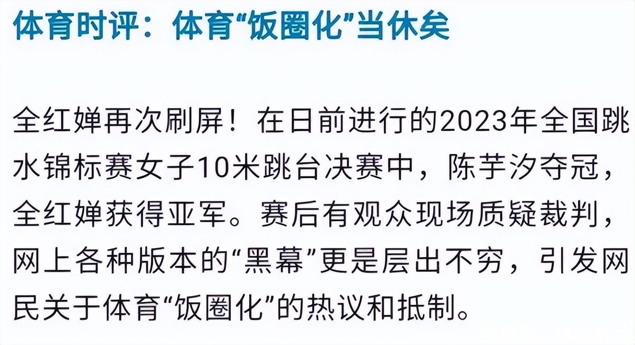 因此,国家权威媒体《新华社》在近期也发表了一篇名为《体育“饭圈化”当休矣》的时事评论文章,在文章中新华社陈述了全红婵目前的情况和面临的挑战,并对全红婵粉丝不理智的行为进行了点名批评。