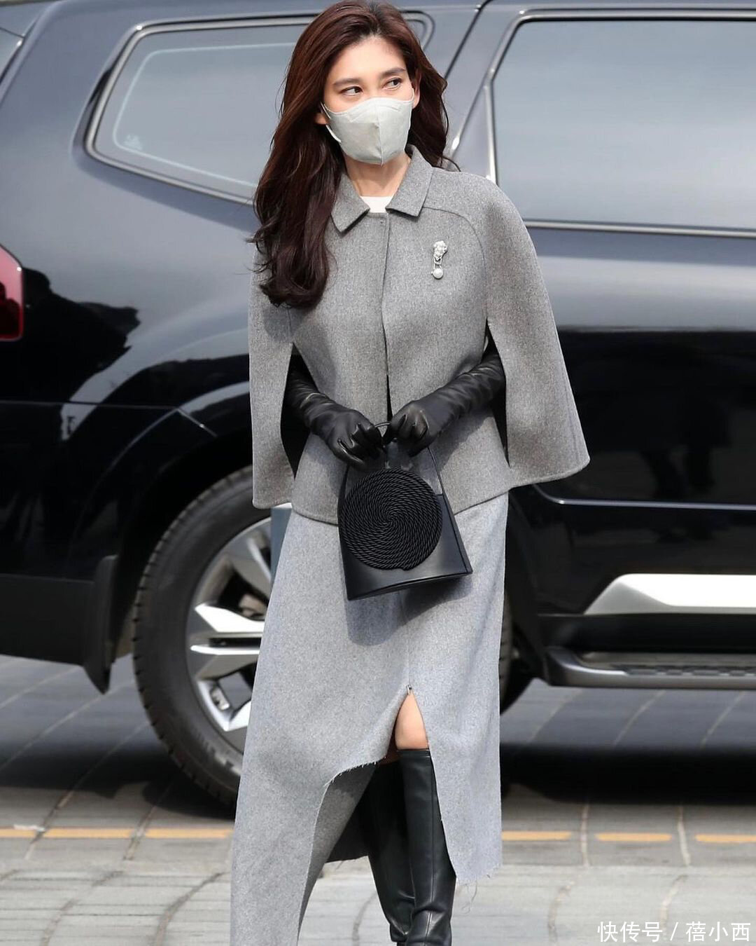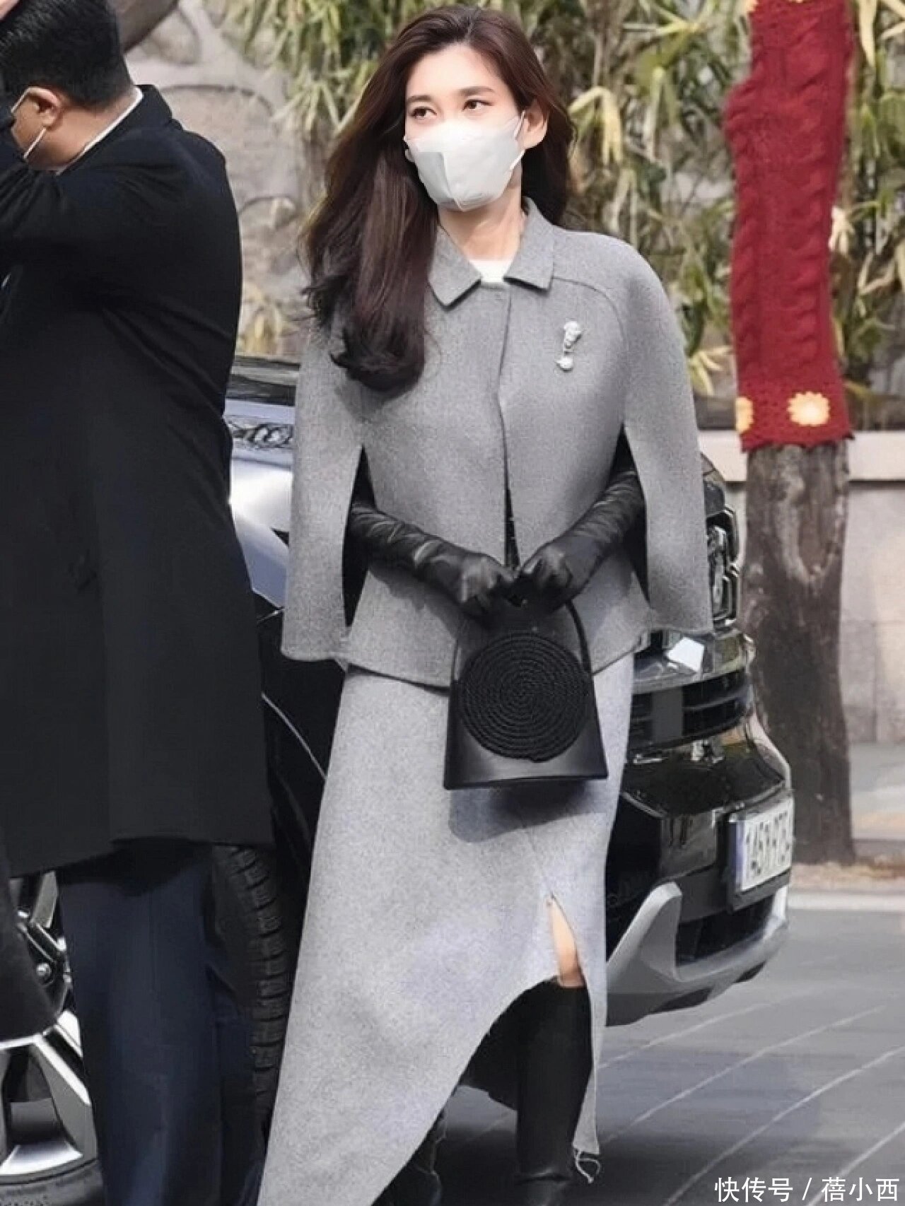 李富真选择的斗篷式毛呢外套,是她冬日穿搭的亮点。这种外套以其独特的剪裁和流畅的线条,展现了一种既时尚又实用的设计感。外套的斗篷式设计不仅为其整体造型增添了一份神秘与高贵的气息,还在冷风中为她提供了额外的保暖。搭配上一条性感的开叉半身裙,她巧妙地平衡了保守与时尚,展现了成熟女性独有的优雅风情。