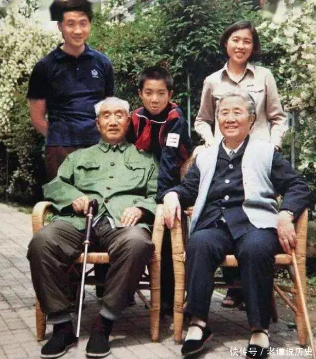 这是80年代,徐向前晚年一张珍贵的家庭照。照片中的他穿着一身绿色的旧军装,拄着拐杖,神态坚毅而沉稳。他的妻子黄杰陪伴在他身边,后排则是他们的儿子徐小岩、孙子徐珞以及儿媳王彦彦。