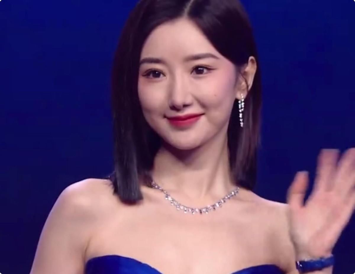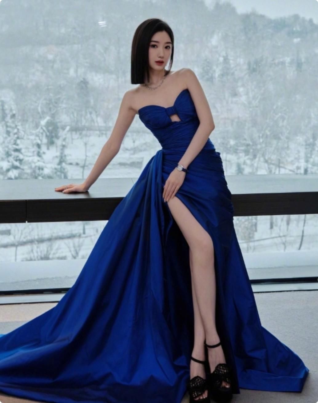 在镜头前毛晓彤的宝蓝色礼裙刚好衬出了她冷白色的肌肤,抹胸礼裙虽然把毛晓彤包了个严实,但很明显这套礼服在毛晓彤的身上有种勾勒曲线的紧绷感。