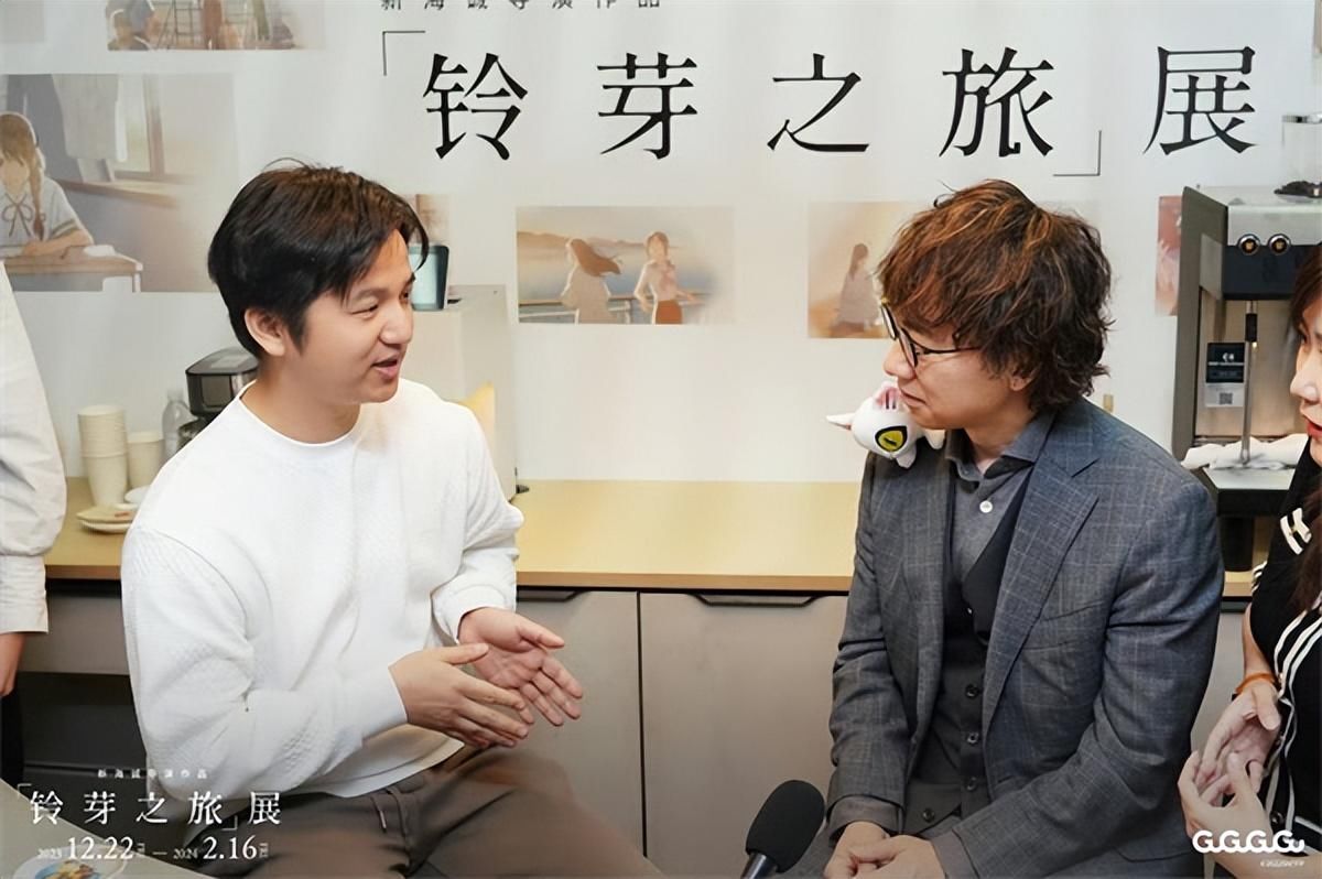12月21日,开展前一天,导演早早来到展览现场,在心愿墙上率先留下亲笔书写,“谢谢大家来,谢谢!新海诚。”当天下午,新海诚导演与国漫代表创作者《罗小黑战记》系列的导演木头梦幻联动,进行对谈。两位导演渊源颇深,木头数十年前就在个人社交平台上支持新海诚导演的作品,并于《铃芽之旅》国内上映之际,为影片打call,亲切地称呼新海诚导演为“诚哥”。新海诚导演在电影首映现场“表白”木头,表示自己作品中的大臣,灵感来源于《罗小黑战记》中的小黑猫“罗小黑”。两位导演向对方赠送礼物,《铃芽之旅》中的大臣猫和《罗小黑战记》的罗小黑首度同框,并围绕“动画电影时代是否已经来临”的话题碰撞出许多火花。
