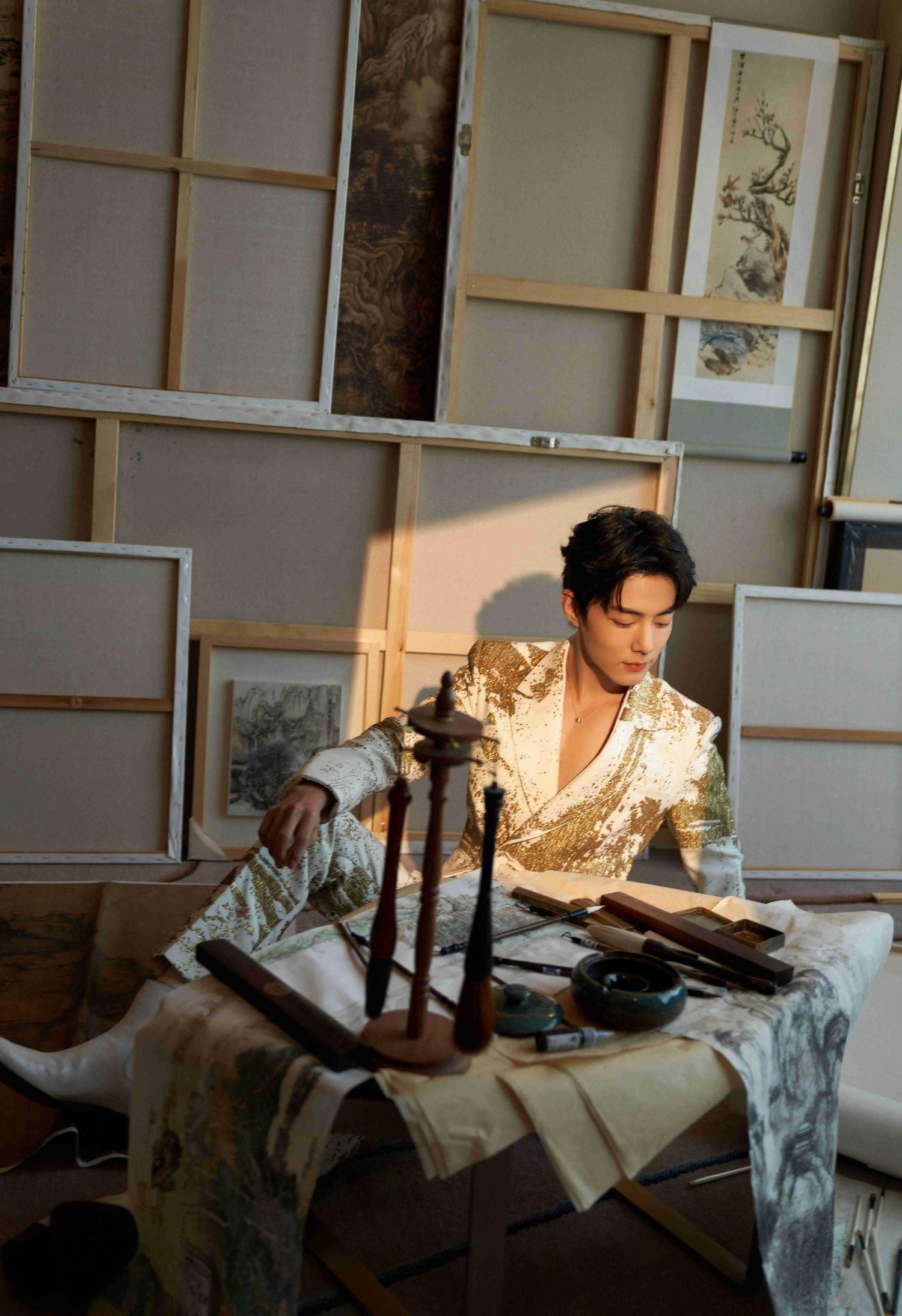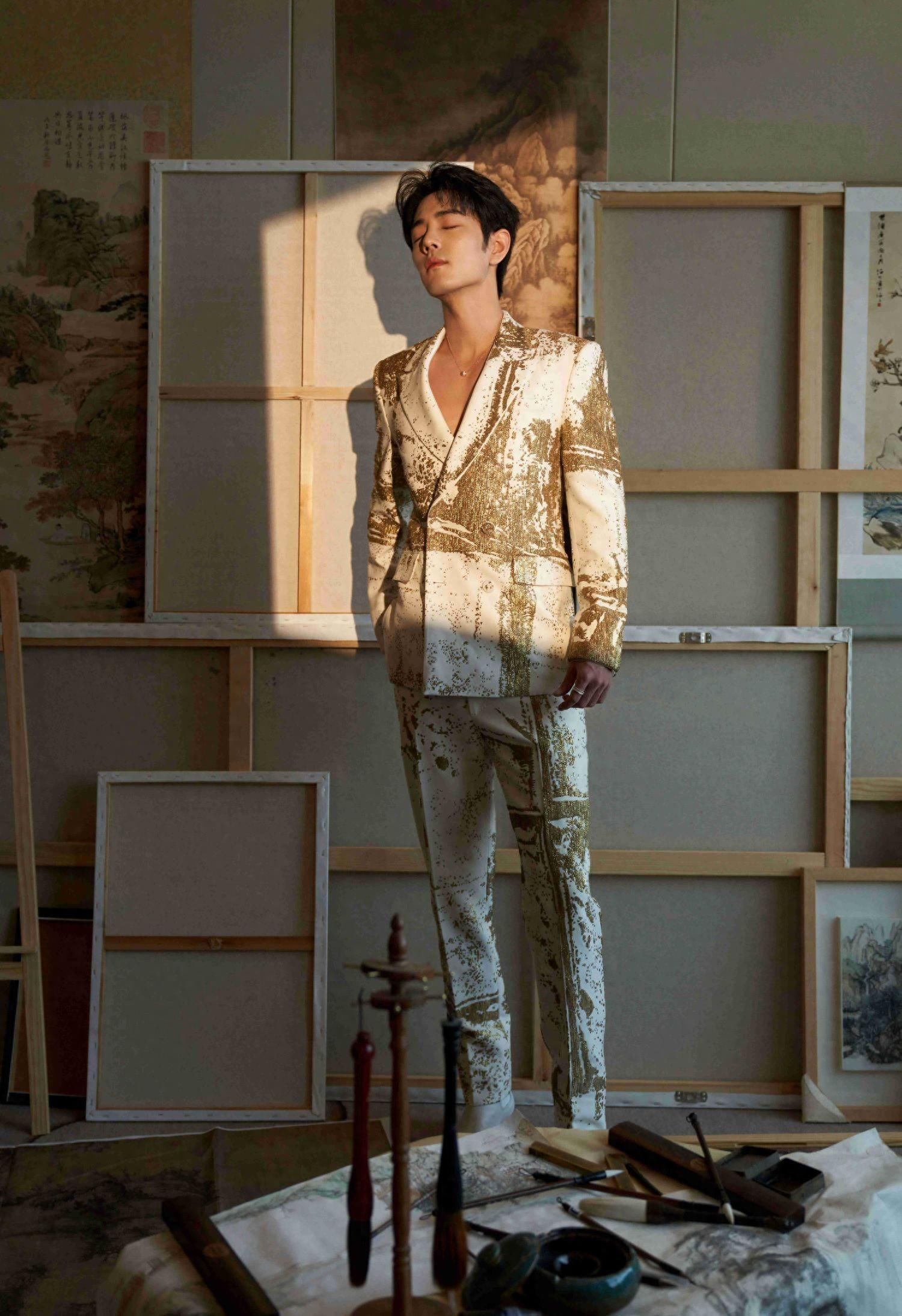 图片中,我们可以看到肖战站在充满文艺氛围的空间内,背景是一排排未完成的艺术画作。摄影师巧妙地利用光影与角度,营造出一种梦幻而深沉的氛围,肖战深邃的眼眸轻闭,仿佛在内心世界游走,这样的场景与他的造型相得益彰,更添了几分艺术气息和诗意浪漫。
