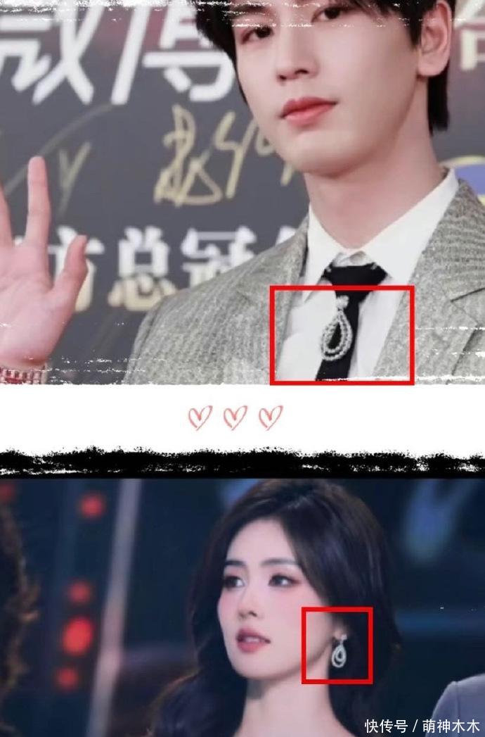 盛典上张凌赫也是很巧合地戴了和白鹿之前活动同款的首饰,张凌赫这次戴的是水滴样式的项链,白鹿之前活动中则戴了一对水滴型耳坠。