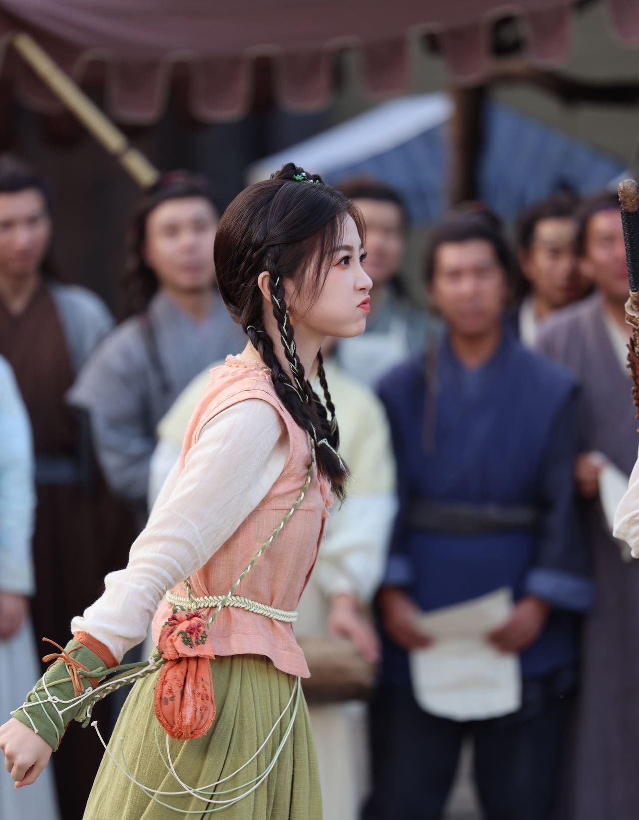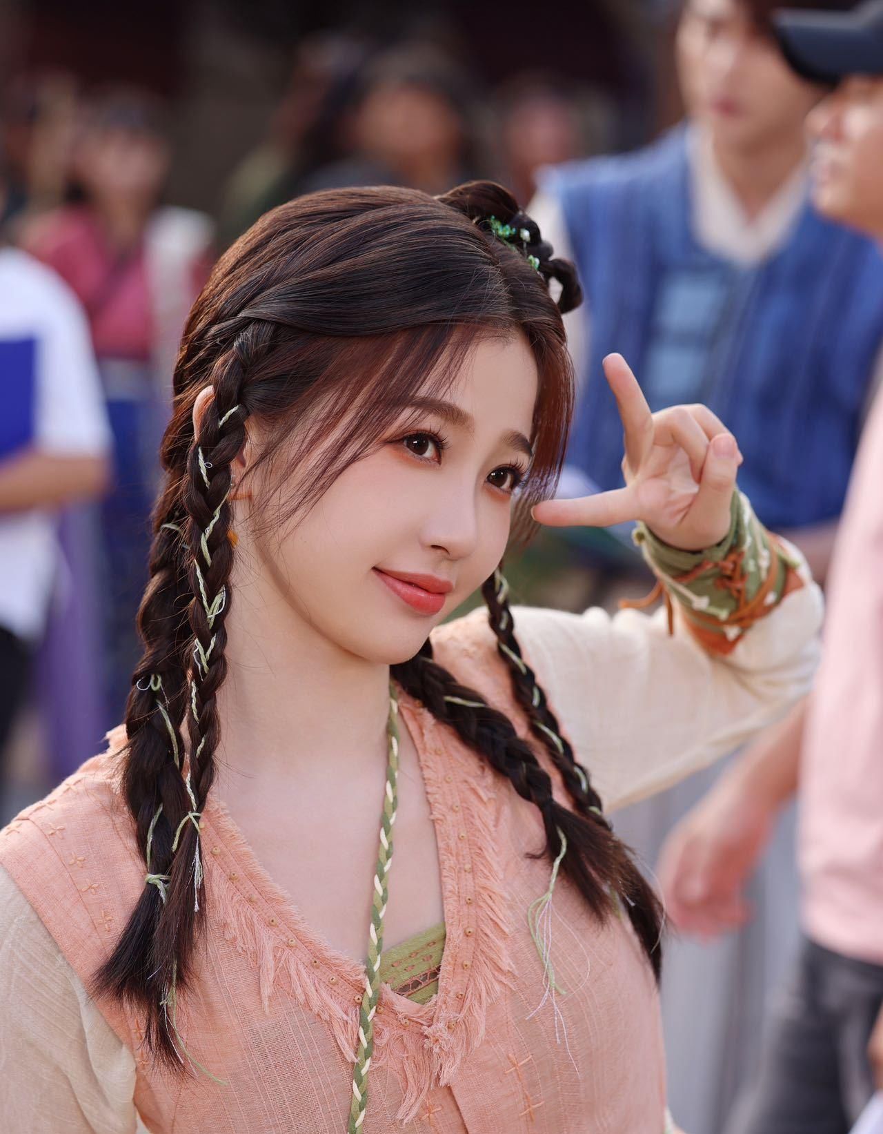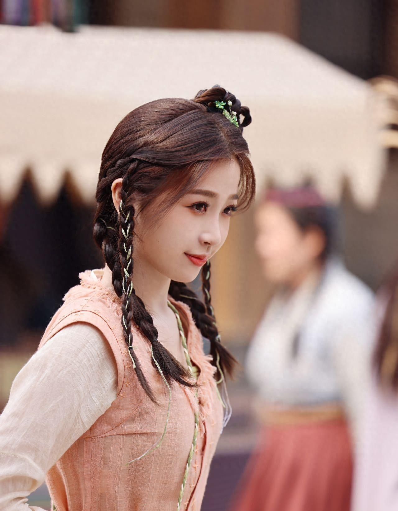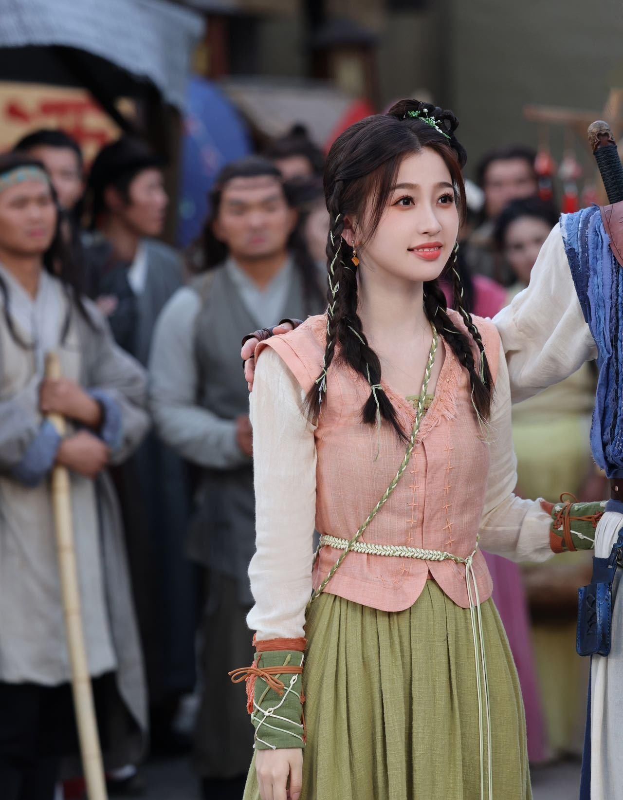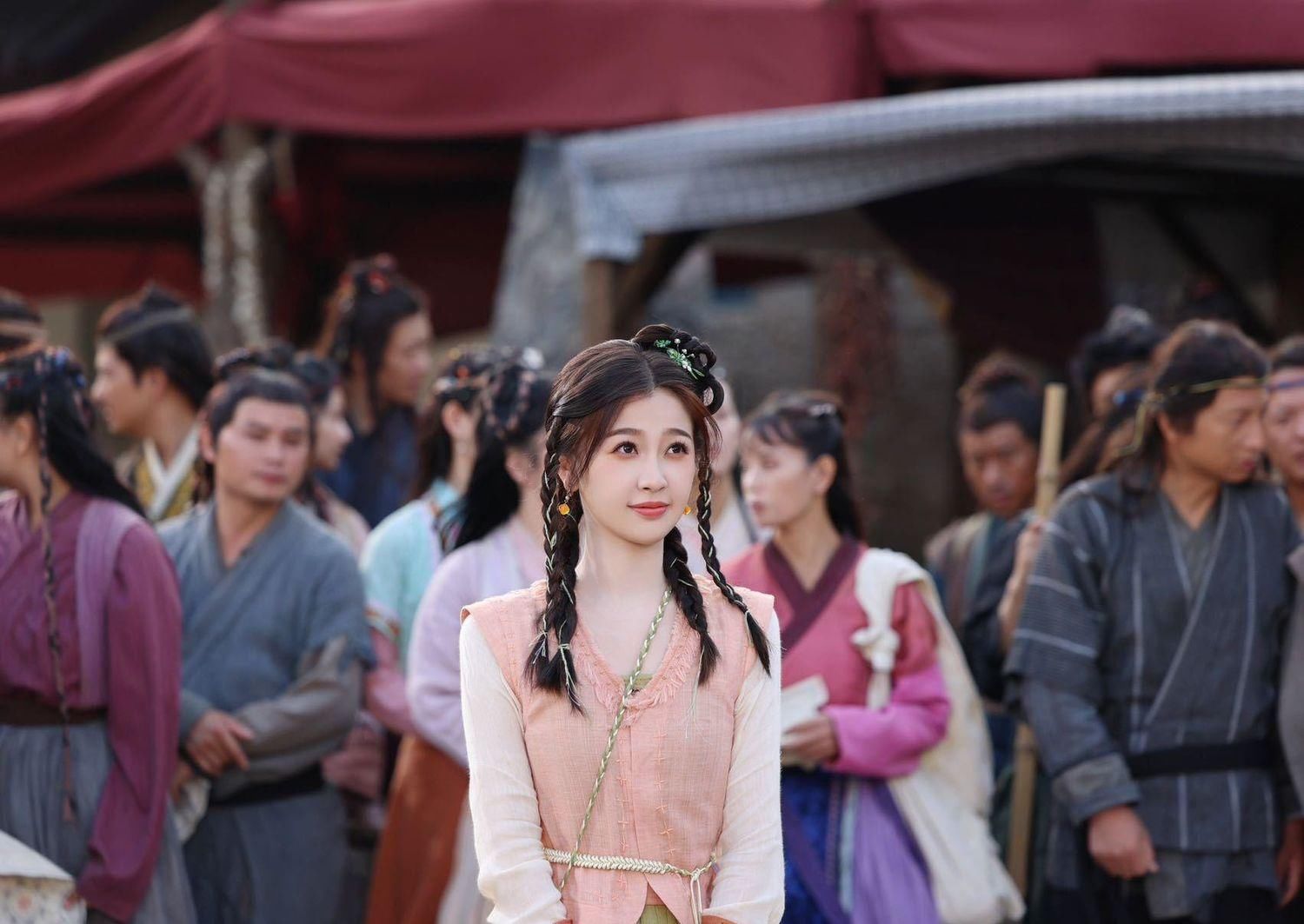 剧照展示的是女主角虞书欣的定妆照,微笑中带着一抹神秘,她的双髻发饰和交错编织的发辫彰显着人物独特的性格。背景中模糊的古装人物增添了一丝古风的朦胧美,让人更为期待这部剧能带给大家怎样的视觉与情感体验。
