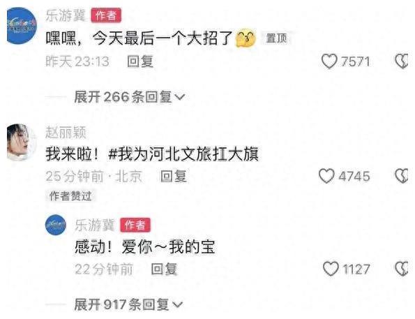 赵丽颖迅速亲自现身评论区为家乡加油助威。她的参与为河北宣传活动增色添彩,拉近了明星与粉丝、地方与游客之间的距离,树立了更加亲民、平易近人的形象,为地方旅游业和文化推广注入新的活力。在她的带动下,网友们也纷纷表示期待她为河北做出更多贡献,甚至要求她拍一部展现河北历史文化的作品。作为家乡的骄傲,赵丽颖一直对河北怀有深厚感情,期待她为河北带来更多惊喜和变化。