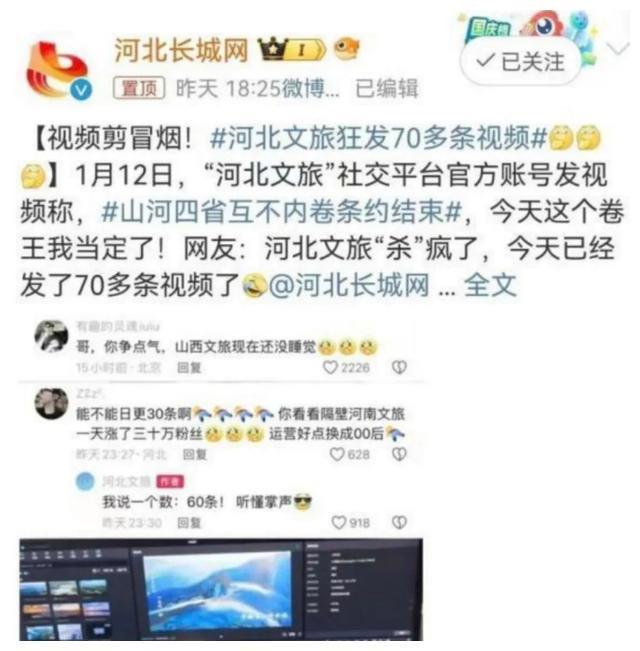 各地文旅部门纷纷出招,进行宣传。河北文旅官方账号连发75条视频,达到发送上限,被网友调侃“小编的电脑都要冒烟了”。近期,“泼天的富贵”砸中了哈尔滨,哈尔滨瞬间变“尔滨”,并引发全国各地文旅纷纷出招。最卷的当属“山河四省”纷纷放出大招。据悉,河南文旅4天涨粉70万,河南省文化和旅游厅官方账号的留言区有网友进行了统计1月11日共发35条视频,1月10日发了28条,1月9日发了24条,这种频繁更新被网友调侃为“题海战术”,目前该账号作品数量已达1.1万。