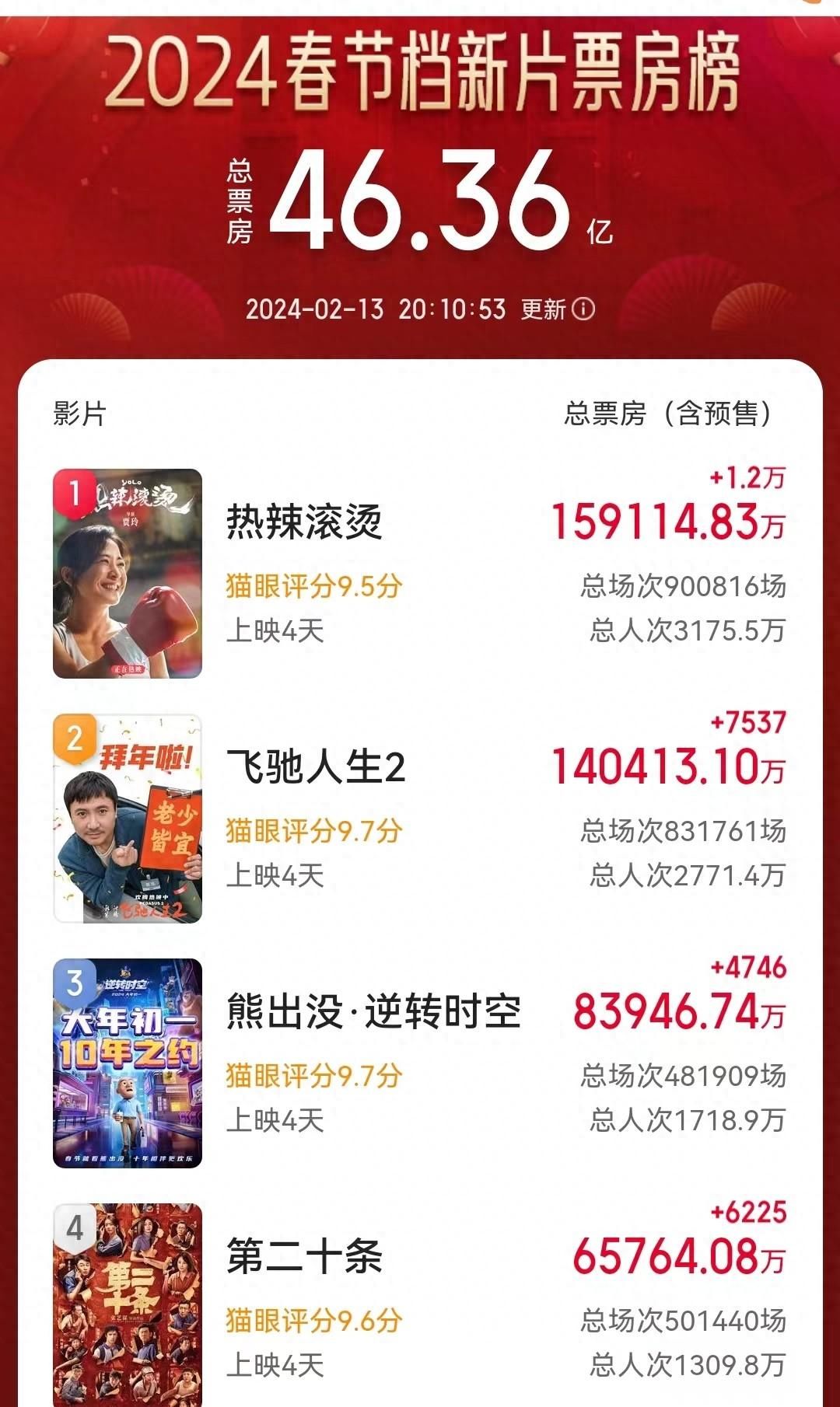 在《热辣滚烫》口碑逆袭上升,成为春节档第一个破10亿票房的电影后,无论同档期电影后续怎么操作,影响力已经不大。