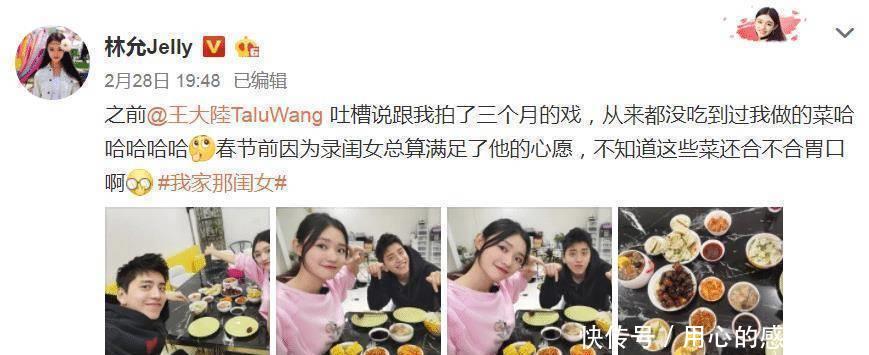 在11月28日这一天,林允就在自己的微博中说王大陆曾吐槽说跟她拍了三个月的戏,但是却没有吃到她做的菜,所以这次她因为录制节目所以满足了他的心愿。而且呢这次她还晒出了两人在家中一起吃饭的照片。而在看到这些照片后,粉丝们也都不淡定了呀!
