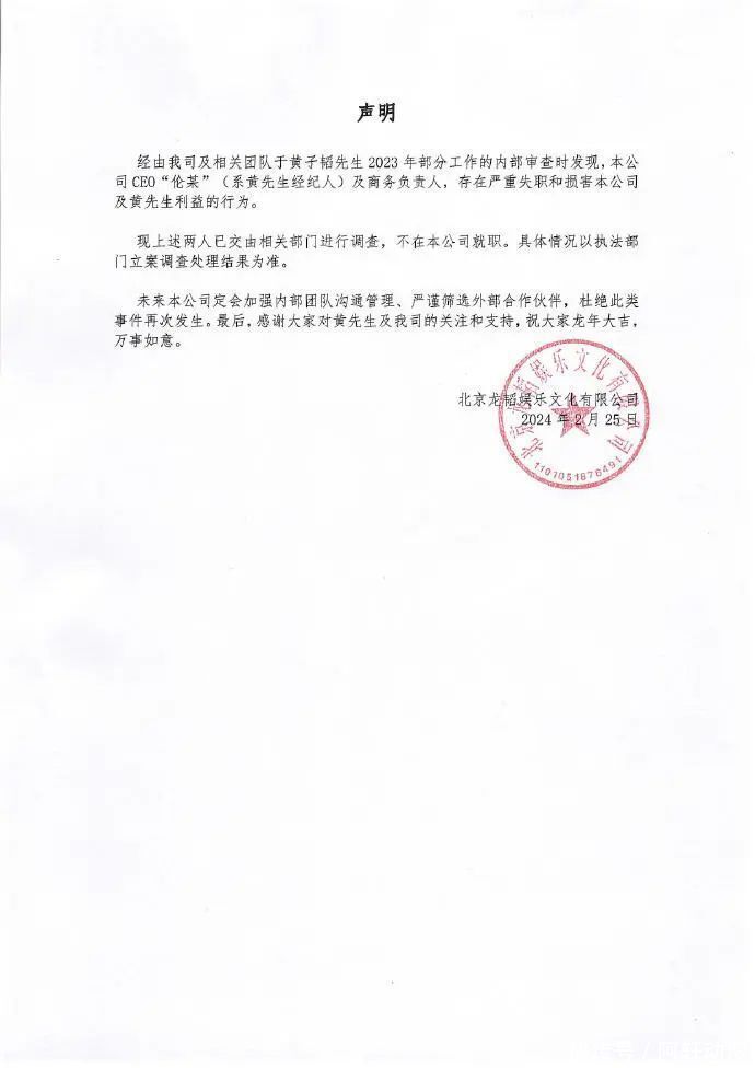 经由我司及相关团队于黄子韬先生2023年部分工作的内部审查时发现,本公司CEO“伦某”(系黄先生经纪人)及商务负责人,存在严重失职和损害本公司及黄先生利益的行为。