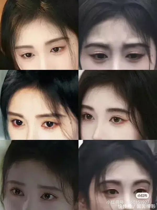雾感的野生眉,厚重的发际线粉,眼线拉长减少面部留白,万年不变的两缕头发遮住太阳穴和颧骨最高点修饰脸型,根根分明的下睫毛又长又细,我见犹怜的蹙眉…是不是似曾相识?