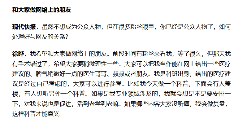随后,徐晔抽空在网上发表了自己的态度,他表示,自己只是一个平平无奇的医生,仅此而已,他的所学、所得,都是为了治疗病患,从死神的手中抢人。