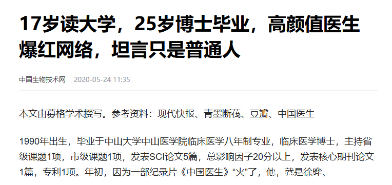 3.中国生物技术网:《17岁读大学,25岁博士毕业,高颜值医生爆红网络,坦言只是普通人》2020-5-24