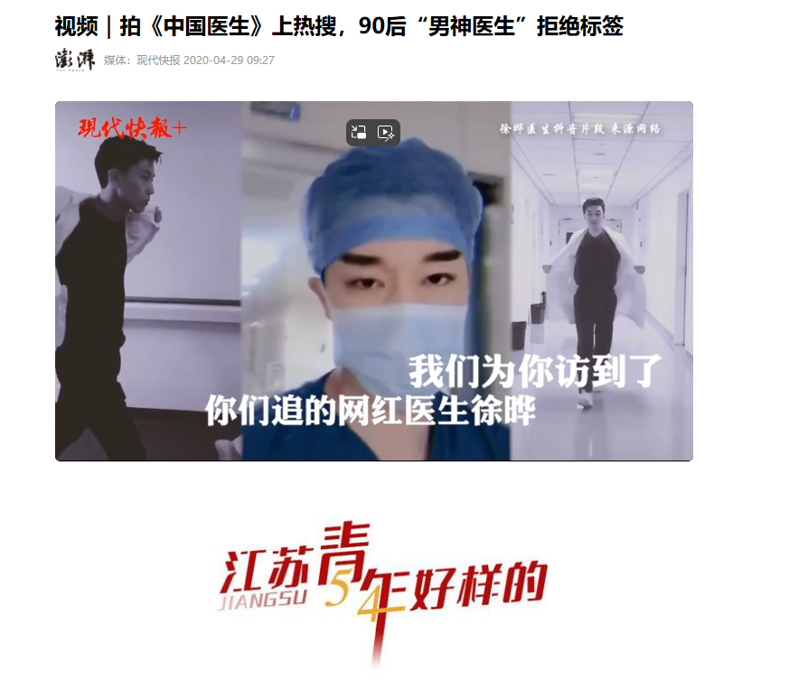 2.澎湃新闻:《视频|拍《中国医生》上热搜,90后“男神医生”拒绝标签》2020-4-29