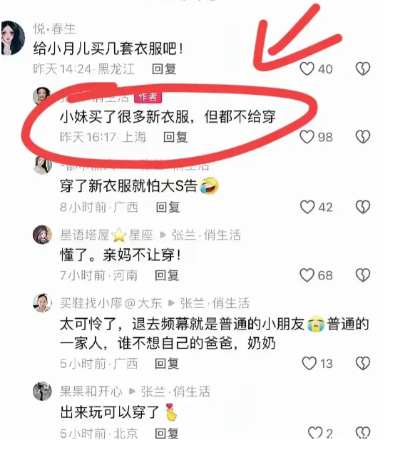 我们都知道正常人出去游玩一般都会精心打扮一番,尤其是明星在带娃出街的时候更是会将孩子打扮得非常可爱清爽,但是作为汪小菲和大S女儿的小玥儿却穿的如此朴素,许多眼尖的网友更是发现接连四天小玥儿竟然穿得是同一件衣服。于是有网友就留言询问原因,而张兰的回应则让我们看出了一丝不一样的味道,张兰称小妹给孩子买了很多衣服,但都不让穿,这个小妹自然是指的继母马晓梅,而那个不让穿的似乎指的就是小玥儿的亲妈大S了。