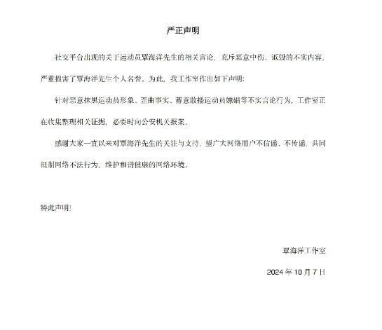 声明中称,网络上有关覃海洋的评论,都是恶意中伤和污蔑,对覃海洋的名声造成了很大的负面影响。目前,该公司正积极搜集和整理有关证据,并对恶意抹黑运动员形象,捏造事实,蓄意散布谣言者,如有发现,将及时报警处理。