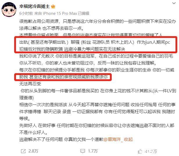 尽管覃海洋本人尚未直接回应未婚妻的爆料,但工作室的声明已经表明了其维护名誉和权益的决心。但显然小胖蛙并不惧怕工作室的回应,继续开始爆猛料。