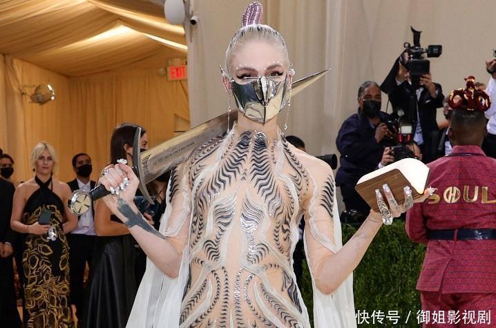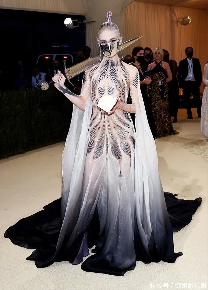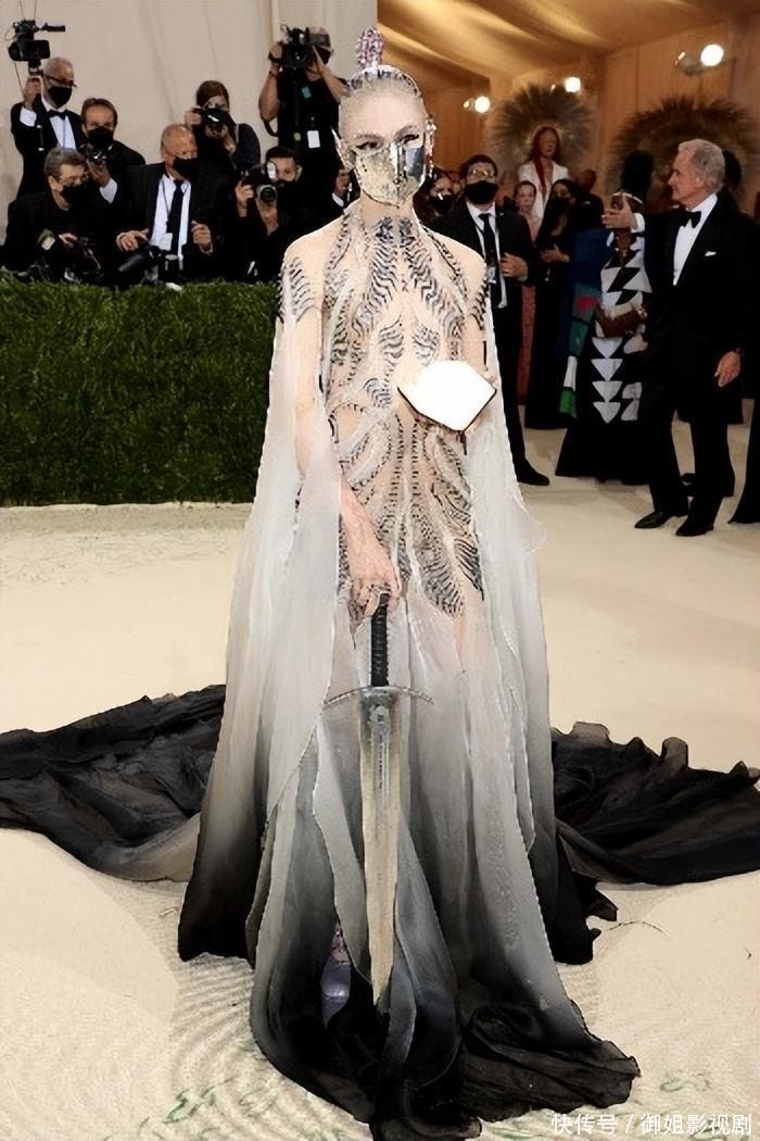 她戴着3D打印的金属面具,穿着一身类似于外星人的奇装异服,手持长剑,一个人走在红毯上,气场两米八。